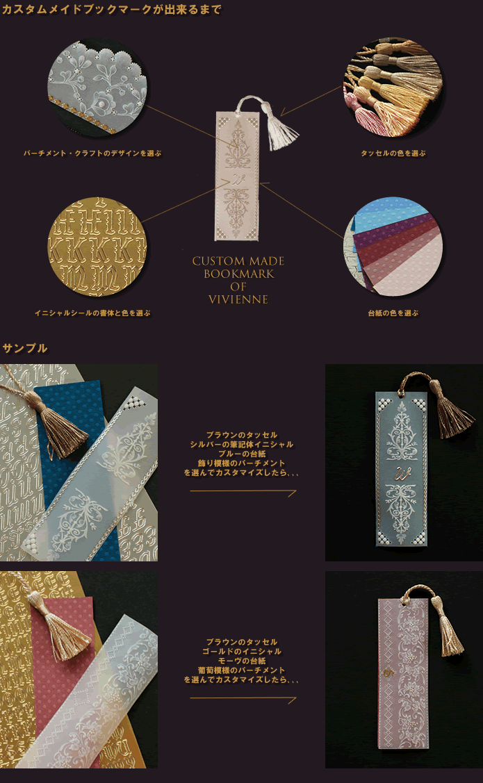 ※台紙やタッセルなどは、資材購入の都合上変更になる事がございます。 パーチメントのサンプルを見る / ブックマークのカスタム工程を見る