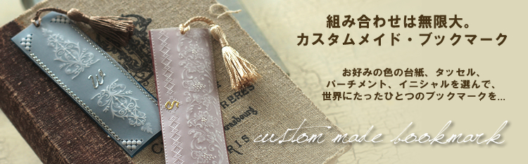 ショップで大人気のパーチメント・クラフトのブックマークが、 カスタムメイドできるようになりました! 数あるパーチメント・クラフトのデザインの中から、お好みのデザインをお選びいただき、台紙や、タッセルの色もお好みで・・・。 イニシャルもお入れする事が出来ます。 価格:1,000円〜3,000円 (パーチメント・クラフトのデザインによって価格が異なります。) ※基本全日サービス可能ですが、都合上ご対応ができない日がある場合は、 ショップブログにて告知させていただきます。